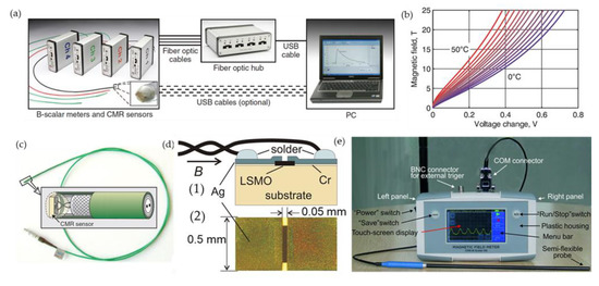 Figure 13. (a) The outside view and schematic diagram of four-channel pulsed magnetic field measurement system based on CMR-B-scalar sensors. Optic fiber cables are used for transfer recorded and stored in the channel signal to PC. (b) Family of calibration curves for a particular CMR-B-scalar sensor. (c) Schematic 3D cross section of the CMR-B-scalar sensor with cable (not to scale). Reprinted with permission from [10]. Copyright 2014 AIP Publishing. (d) Schematic drawing of the cross section of two-terminal sensor with bifilarly twisted wires (1) and its picture with two Ag electrodes before soldering wires (2). Reprinted with permission from [62], copyright 2012 IOP Publishing. (e) Outside view of a hand-held CMR-B-scalar-06 magnetometer with a color touch screen for a waveform display. The hand-held semiflexible probe is connected to the device. Reprinted with permission from [98]. Copyright 2020 IEEE.