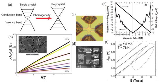 Figure 15. (a,b) Linear classical magnetoresistance in macroscopically inhomogeneous InSb: (a) inhomogeneities create tails in both the conduction and valence bands and cause them to overlap; (b) the linear magnetoresistance in the temperature range of (200–350) K. Inset: SEM image of an InSb polycrystal with typical grain size of 10–20 µm. Reprinted with permission from [111]. Copyright 2008 Springer; (c) picture of micro-Hall probe (MHP) based on Sn-doped n-InSb/i-GaAs MBE-grown heterostructures. The chip dimensions: 0.5 × 0.5 mm2 with square sensitive area 20 × 20 µm; (d) the mesa of the MHP chip (0.6 × 0.6 mm2 and sensitive area 115 × 33 µm). Reprinted with permission from [21]. Copyright 2010 Springer; (e) magnetoresistivity (left scale) and Hall voltage (right scale) for MHP measured at T = 1.1 K ( I A C 13   H z = 50 μA). The SdH oscillations in the Hall data are invisible due to the scale of this graph. Reprinted with permission from [112]. Copyright 2004 Elsevier; and (f) Hall signals measured in pulsed magnetic field. Solid lines: corrected Hall signal at three pulses (shifted). Dashed line: as-measured signal at the 87.2 T pulse. Reprinted with permission from [21]. Copyright 2010 Springer.