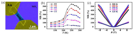 To diminish parasitic pick-up voltage during measurements of high pulsed magnetic fields, a two-electrode configuration is preferable [11]. Tong et al. [115] proposed free-standing InSb single-crystal nanosheets with only two electrodes for future magnetic field sensors with nanoscale dimensions of the sensor’s sensing area. Figure 16a presents scanning electron microscopy (SEM) image of the proposed device. Figure 16b,c shows MR dependences on temperature and magnetic field, respectively, up to 9 T. One can see that such a linear MR, which is almost insensitive to temperatures in the range of 250–300 K might have potential practical applications in magnetic field sensors operating at and around room temperatures [115].