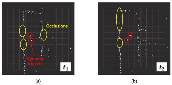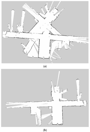 SLAM (Simultaneous Localization and Mapping) is a method which allows a mobile robot to build a map and estimate its location simultaneously in an unknown environment [1,2,3]. Despite recent studies in novel SLAM algorithms, SLAM in dynamic environments is still being studied for its more robust performance [4,5]. In 2D SLAM, when objects are dynamic or interrupt the light from a LiDAR (Light Detection and Ranging) in an environment, the detected environment by the sensor changes by seconds [6,7]; thus, the accuracy of SLAM degenerates, as shown in Figure 1.