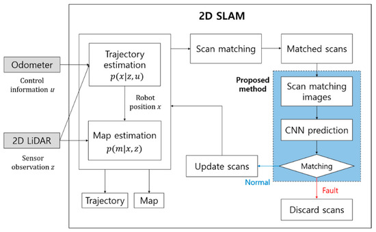 In environments with various dynamic scenarios, the raw scan data are acquired by a 2D LiDAR. The scans are then matched with ICP (Iterative Closest Points) scan matching. The matched scans are converted into scan images to be fed as training data for the CNN model for fault detection. When new scan data are acquired, the trained model detects faults in scan matching. The sequential tasks of acquisition of raw scan data, scan matching, conversion of matched scans into images, and fault detection are performed in a single process.