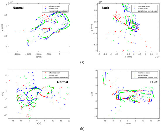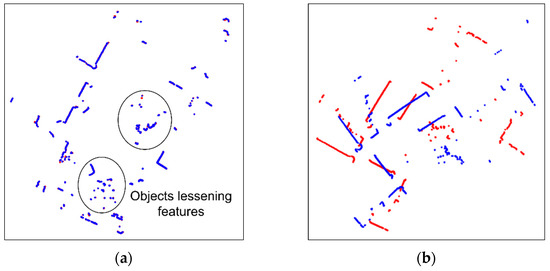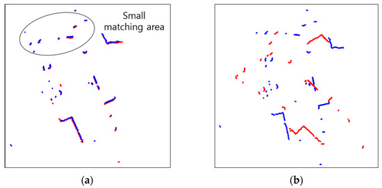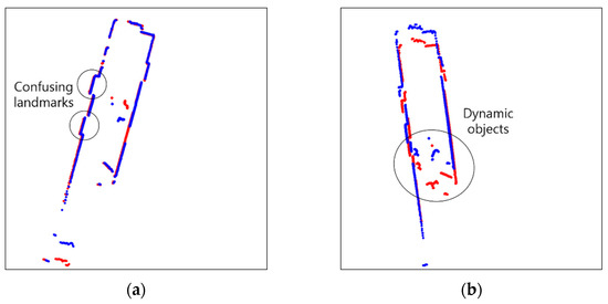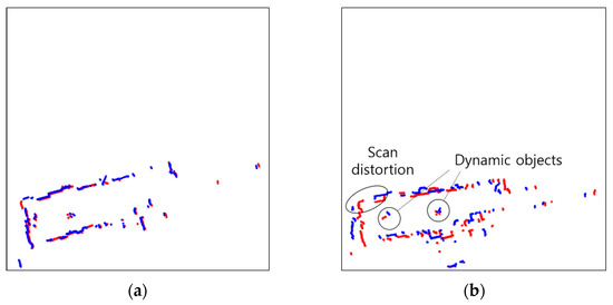 Scan matching images in environment 2 (Red: Previous scan, blue: current scan). (a) Normal matching images; (b) faulty matching images.