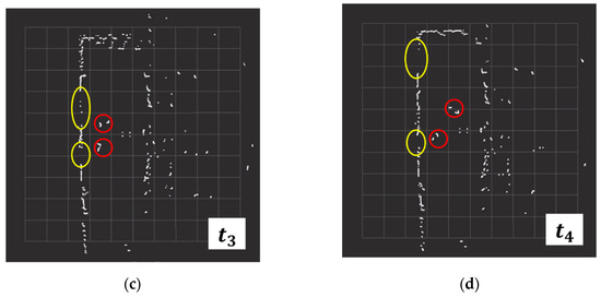 Dynamic objects and scan occlusions in raw scan data. The positions of objects and the occlusions of scans are changed over time. (a) t = t1; (b) t = t2; (c) t = t3; (d) t = t4.