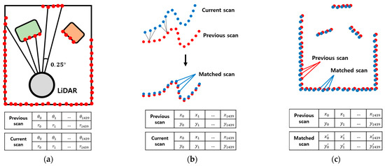 Scan matching is an important technique which allows SLAM to match the current scan to the previous scan of two consecutive laser scans by searching the overlapping parts [19]. ICP (Iterative Closest Points) [20,21,22,23,24], PSM (Polar Scan Matching) [25,26,27], and NDT (Normal Distributions Transform) [28,29,30] are representative scan matching methods. However, in dynamic environments, objects which move over time lessen the resemblance of two consecutive scans, making it challenging to perform accurate scan matching, as shown in Figure 4. In GMapping, scan matching is used to compute the maximum likelihood of the current robot position. The corrected robot position achieved via scan matching is defined as: . However, scan matching may fail in dynamic environments, since the sensor data for the computations of the two posterior probabilities of the robot trajectory and the map are disrupted.