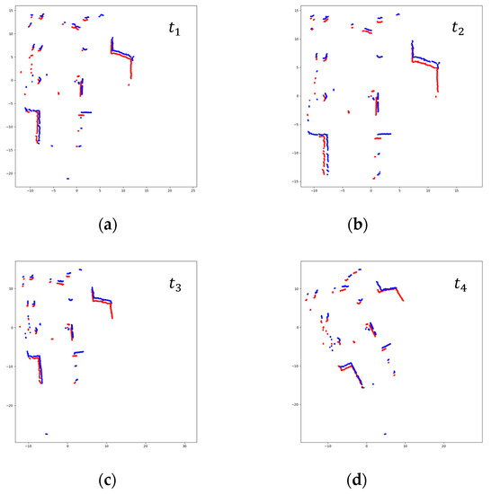 Conversion of scan pairs into images before preprocessing (Red: previous scan, blue: current scan). The areas where scans are plotted are not fixed. (a) t = t1; (b) t = t2; (c) t = t3; (d) t = t4.