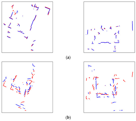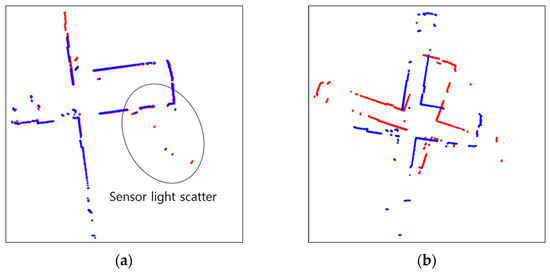 Scan matching images in environment 1 (Red: Previous scan, blue: current scan). (a) Normal matching images; (b) faulty matching images.