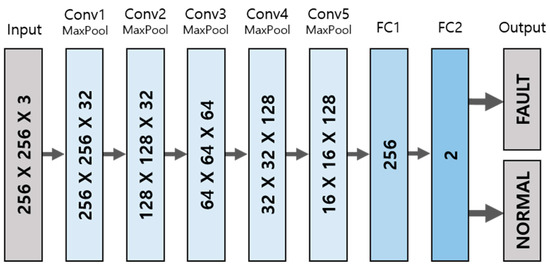 For the preprocessing of plotted images, the unnecessary edge parts of scales are eliminated, and the sizes are reduced by about 1/16, to a final total of 256 × 256 pixels. The images are reduced in size for fast CNN model training while maintaining the features of scan matching. The processed images are automatically saved, then classified into binary class labels of normal and fault, as shown in Figure 8. The image generation and preprocessing were performed using matplotlib, a python visualization tool, which has a much shorter processing time than MATLAB.