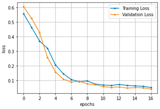 The CNN model used to perform the fault detection of scan matching has an architecture shown in Figure 9. For the model to distinguish two scans in different colors, the input images have 256 × 256 pixels with three dimensions of RGB. The raw pixel values of 0 to 255 are normalized in values between 0 and 1. For the feature extraction of images, five 2D convolutional layers are composed of the activation function ReLU (Rectified Linear Unit). Since the training images consist of primarily white backgrounds and limited areas of scan pairs, max-pooling layers are added for each convolutional layer to take meaningful values in feature maps. In addition, a quarter of neurons are dropped out after each max pooling to prevent over-fitting. Fully connected layers to flatten the extracted features follow the convolutional layers, resulting in the likelihood of class labels with the activation function Softmax; thereby, the scan matching can be found to be normal or faulty. For training and validation, binary_crossentropy loss for binary classification and Adam optimizer are utilized. The training epochs are set to 17, since the iteration number was sufficient to train images. Too much repetition of training may cause an over-fitted model. The batch size is set to 32 for the fast training; this value is not too large to affect the training accuracy. Both the training and validation loss desirably decrease during the training repetitions, as shown in Figure 10.