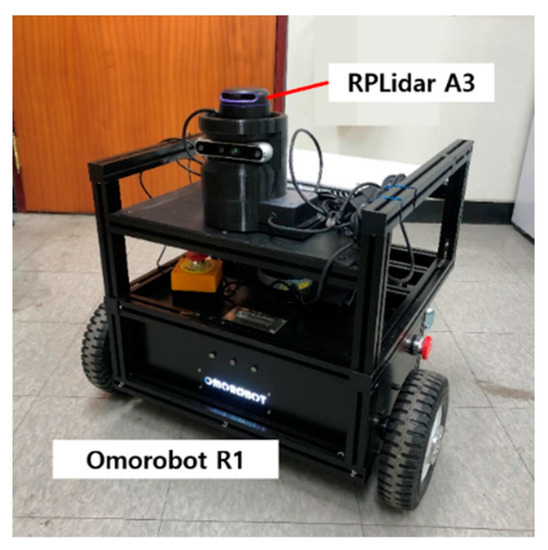 The mobile robot used for experiments is Omorobot R1, which has a maximum speed of 1.2 m/s and an odometer for the control information, as shown in Figure 12. For the detection of environments, RPLidar A3 is used with a maximum detection distance of 25 m, taking 1440 points for each scan with 360° of FoV (Field of View). With the sensor with high angular resolution (0.25°), acquiring large amounts of data is possible. The Willow Garage dataset has exceptive data, of which laser scans have 1040 points with 270° of FoV.
