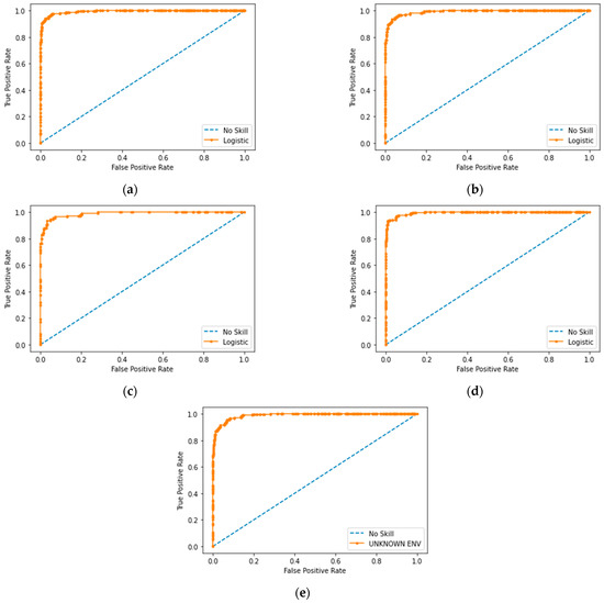 ROC curve of prediction in (a) Environment 1; (b) Environment 2; (c) Environment 3; (d) Environment 4 and (e) Environment 5.