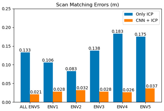 The results are also presented as ROC (receiver operating characteristic) curves in Figure 18. As shown in the graphs, the trained CNN model accurately detects the faults of scan matching, regardless of the environment. The proposed method is adaptive for various environments with their own features. In addition, we compare the proposed method to the original ICP in terms of scan matching error, as shown in Figure 19. The error is defined as the Euclidian distance between the centers of mass of two matched scans, as described earlier in Section 2.2. The smaller the error, the more accurate the scan matching. The inaccuracy in matchings decreases by 75% using our CNN method.
