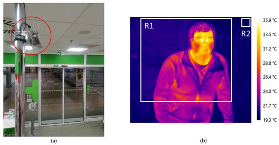 The place of measurement system installation—pharmacy in a shopping center: (a) placement of the IR camera (highlighted in red oval) and its view to the automatic entrance doors; (b) IR image (thermogram) of passing person (author 1).