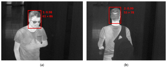 The evaluation of IR images was performed with the help of AI. Head position (from the front and back) was detected from IR images. Data from the first month were used for training purposes. Altogether, 7648 images were collected. Each head position was then tagged by hand. The individual thermograms were resized to a resolution of 300 × 300 pixels and transformed to greyscale images with fixed temperature ranging from 12 to 42 °C. The obtained images were normalized to take values of 0–1, a standard step that leads to faster solution finding (convergence). To improve model accuracy, additional augmented images were created by shifting, cropping and adding noise, resulting in a total of 23,761 training samples. The network SqueezeNet-SSD [18] was used and trained using Caffe framework [19]. It was trained for 220,000 iterations with a base learning rate of 0.0005. A training loss of 0.61 was achieved. The network provided information about the category—front/back of a head, and further about the size of the head, its location and the calculated confidence of a given category. The result of the proposed procedure is presented in Figure 3 as an example for an (a) incoming and (b) outgoing person.