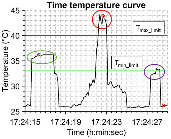 A MATLAB script based on temperature identification of persons was developed for separation of each person and determination of their temperatures. The script works in several steps. At the beginning, the input data (text file from continuous data recording) are loaded. The second step is to create a vector of parts of the whole day temperature time dependence where the values are higher than the preset threshold Tlim. The value of the Tlim parameter is chosen with respect to distinguishing between person and no person, so the value Tlim = 33 °C was chosen because people with a temperature lower than 33 °C are not expected in a shopping center. These parts must be more than one second away from each other. Otherwise, the part of the vector is not considered as two different people. The third step is to check if the maximal value from the vector part is inside an allowed temperature range that can have a live human being. This range is controlled with limits Tmin_limit = 33 °C and Tmax_limit = 40 °C, and these values were chosen for rational reasons. Together with the temperature range check a check of time duration of being in the view of the camera is made that must be longer than 1 s. There is a group of temperatures belonging to separated persons after such procedure that can be called temperature–time identification of persons (TTI). Its functionality is presented in Figure 4, where 14 s of measured temperature–time dependence is shown. The person with a normal temperature is captured in the green oval, a hot object is in the red oval (in this case a cup of coffee) and in the violet oval there is probably a person from behind because of the lower temperature that is above the limit value of 33 °C but its time duration is too short (less than 1 s). The time of capturing of one IR image is highlighted with a red spot (it can be seen that the IR image can be taken after the appearance of the person in the view of the IR camera).