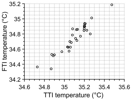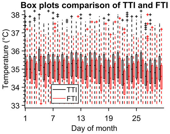 The graph in Figure 7 shows boxplots for TTI and FTI for one month. It is obvious that the FTI average temperature (Tmean_FTI = 34.745 °C) is lower than TTI (Tmean_TTI = 35.099 °C) and also has a smaller standard deviation (0.851 °C for FTI and 0.908 °C for TTI). Nonetheless, we can notice a correlation in average temperatures which can be better visible in Figure 8. This indicates that when working with average temperatures both algorithms are interchangeable.