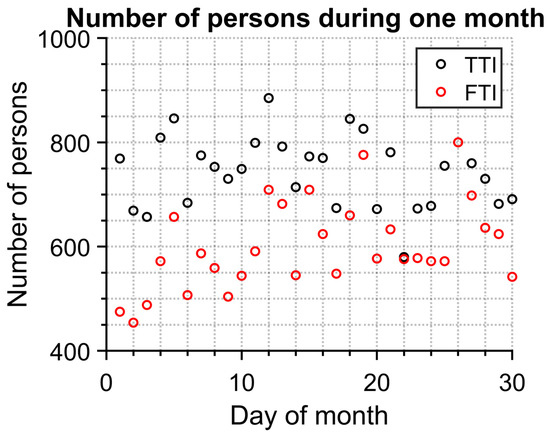 The number of identified people and their maximum temperatures obtained by both methods are in good correlation. The mean value of temperature for the TTI method is 0.35 °C higher than the mean temperature resulting from the FTI method, and the values of standard deviations are almost the same for both methods, approximately ±0.9 °C—see Figure 7. The number of people measured with the IR camera identified by the FTI and TTI methods differs on average by 150 persons per day because of the method of evaluation of the single IR images (only a person facing the IR camera works for the FTI method).