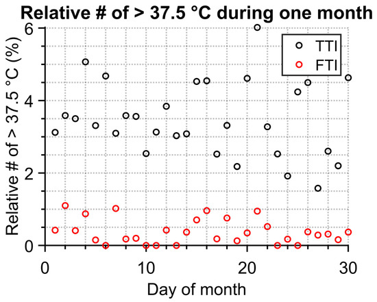 Typically, the normal human temperature with an armpit thermometer is below 37 °C. Anything above can indicate some kind of illness. Therefore, the epidemic status could be estimated based on how many people had high temperatures. The temperature 37.5 °C was the chosen threshold between a healthy and a sick person. The result in the form of relative number of people with higher temperature is in Figure 10. Neither FTI nor TTI show distinct peaks/trends for the one-month measurement. Nonetheless, the difference between each method is not insignificant. TTI values have a much higher spread and mean value. This may be due to the higher count of identified objects as persons with higher temperatures (as was previously mentioned, this can also be caused by hot objects which are not persons), as shown in Figure 7, where a non-negligible number of high-temperature outliers can be observed.