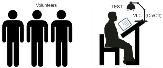 A significant experimental campaign was carried out by submitting color and reading tests to volunteers, where each test was first lit with VLC on (modulated light) and then with VLC off (nonmodulated light).