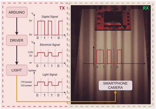 In our implementation, the light signal at the output of the LED lamp was obtained by 3 blocks (Figure 2, left side): an Arduino block (which created the digital signal), a driver block (which created the electrical signal), and the LED light block (which converted the electrical signal to a light signal). The signal transmitted by the LED lamp can be represented by a time-dependent rectangular function