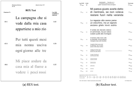 The Radner Reading test (Figure 3b) [21] is an eye chart that allows evaluating the near visual acuity. The chart presents 24 phrases that present a standardized structure. From top to bottom, the font size decreases by 0.1 logarithmic units. The reading time (s) was measured, and the reading speed was calculated using the following equation [22]: