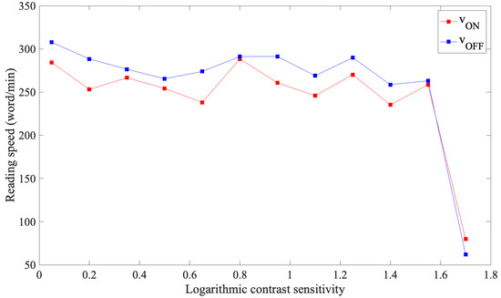 The subjects had to read the twelve phrases of the REX test, one time with the VLC lamp ON and another time with the lamp turned OFF without them knowing it. Reading times (, ) were measured for each phrase with a different contrast. Thus, the reading speeds (, ) were calculated using the Equation (3).