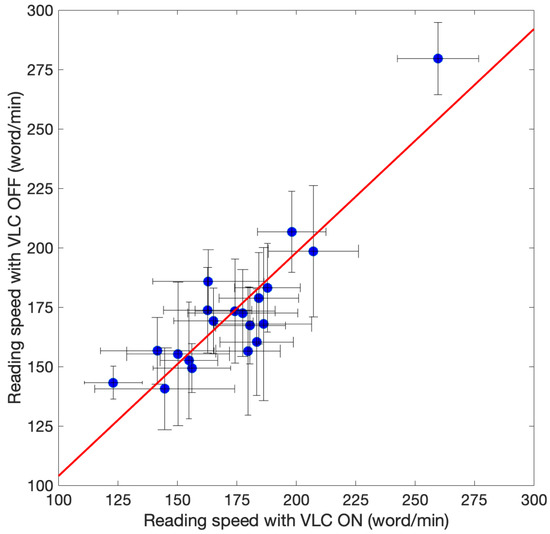 The same subjects were asked to participate in the Radner test. In a similar manner as the REX test, the reading times for phrases corresponding to various visual acuities (VA) were measured. The reading speeds (, ) were calculated using Equation (4). Similar to the REX test, the critical values of VA were detected for each participant, and the average and standard deviation of the reading speeds were determined, after excluding the reading speed values past the critical point. In Figure 7, the values of and of the subjects obtained from the Radner test are reported. Similar to the REX test, no significant change in reading speed with VLC ON and OFF was observed in the Radner test (). Therefore, also for the Radner test, we concluded that the presence of the VLC lamp did not influence the contrast sensitivity of the patients or their reading times.