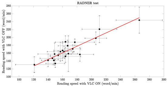 Our experiments showed that there were no differences in reading speed with or without data transmission through the light source. The tests (REX and Radner) showed an almost perfect linearity of the regression curve, with a Pearson correlation coefficient of and , respectively, between volunteer reading speed with and without VLC-modulated light. The statistical analysis for the REX test resulted in a bias of and a standard deviation of the difference between the two measurements of . For the Radner test, the bias was , and the standard deviation of the difference was . This finding can assure that VLC technology can be used in offices, schools, or other locations where reading plays an important role.