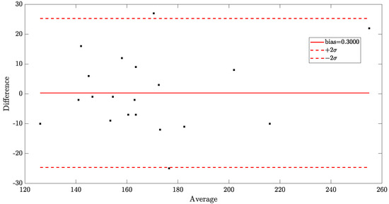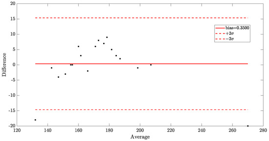 A Bland–Altman plot [29] was also drawn for the results of both the REX (Figure 8) and Radner tests (Figure 9). The statistical analysis for the REX test resulted in a bias of 0.3500 and a standard deviation of the difference between the two measurements of 7.6590. For the Radner test, the bias was 0.3000 and the standard deviation of the difference was 12.7325.