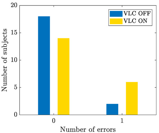 For the Ishihara test and the CUT, the number of errors made by the subjects were counted when the VLC lamp was on and when it was off. Figure 10 reports the registered errors with the Ishihara test. To understand if the differences were statistically significant, the Fisher exact test [30] was conducted. The p-value was 0.2351, which is much greater than 0.05, which showed that the reading speed (of colored texture) was not influenced by the presence of the VLC device. As such, it was not necessary to conduct any statistical tests for the CUT, as the same number of errors was observed with the VLC on and off.