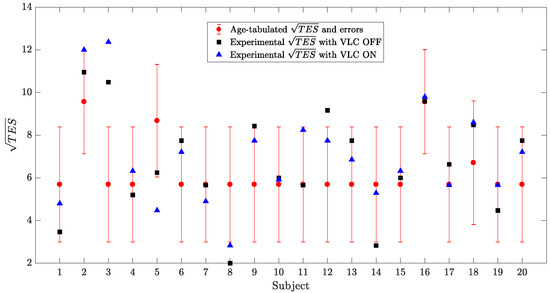 Representation of square roots of the total error score values for each subject. In red, the average values of and their statistical error based on the age range of the patient are reported [27]; in blackm the measured with VLC OFF is reported; and in blue, the measured with VLC ON is reported.
