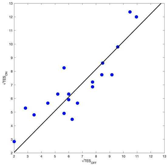 To summarize the results regarding the Farnsworth–Munsell 100 Hue Colour Vision test a t-test was conducted comparing the with VLC OFF and with VLC ON. There was no significant difference in the two , . In Figure 12, there is a dispersion plot of the two . The best fit for our data using the least-squares method without intercept reported an angular coefficient , well compatible with . The correlation coefficient was .