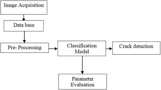 The research of Zhang et al. [16] relies heavily on the concept of feature fusion. The crack images are very susceptible to noise. It cannot be guaranteed that all the images can be taken in well-lit conditions. In similar research, the researcher used a multiscale-fusion generative adversarial network (GAN) to improve the quality of the output images while preserving the features of the original images. However, they assumed the noise type to be Gaussian and the variance to be between 0.05 and 0.2 [17,18]. Junmei Zhong et al. [19] took a different approach for reducing the noise; by using orthogonal wavelet transform (OWT), the higher scale levels are preserved, and noise in the lower level is filtered by using minimum mean squared error. Although this noise reduction method was yielding better results, they only reported it for images with Gaussian noise. Ehsan Akbari Sekehravani et al. [20], utilized the Canny algorithm for edge detection. Traditionally Canny is implemented with Gaussian filter, but to counteract any type of noise, the authors utilized a filtering approach. Another unique method is denoising the images using the Wiener filter and detecting cracks by the Otsu method [21]. Kittipat Sriwong et al. [22] and discussed various CNN-based algorithms for efficient crack detection. Even though the technique implemented in [23] was not able to carry out a proper categorization of the crack image, it could detect cracks even on road markings using ResNet-v2 algorithm. By adding feature fusion and network in network (NIN) modules, the edges were highlighted and also prevented the loss of model features, in the meanwhile reducing the time complexity. In [24], to inspect the severity of the crack, the authors used crack magnifier. The deep learning models such as VGG-16, ResNet50 and Inception ResNet-V2 are discussed in [25,26,27]. Paramanandham et al. [28] discussed about concrete crack detection using various deep learnbing models. Qi Chen et al. [29] used the guided filter approach for the removal of noise and analyzed the characterization of the crack structure using Hessian structures followed by refinement process. The authors achieved around 90% in precision, recall and F1 measurements through the implemented approach. Dawei Li et al. [30] developed a defect detection system for metro tunnel surfaces. Junjie Chen and Donghai Liu [31] proposed a model for detecting damage in the water channel based on super pixel segmentation and classification and achieved an accuracy around 91%. Miguel Carrasco et al. [32] discussed a methodology for measuring the width of cracks using smoothing, filtering, segmentation and estimation. The authors of [33,34,35,36,37,38,39,40,41] proposed several techniques based on CNN, pyramidal residual network for concrete crack detection, binocular vision system for pipe crack and deformation detection and also analyzed the performance of the techniques. From the literature, it can be identified that the existing techniques for detecting cracks can be classified into two broad domains. One is based on the combination of several networks or concentrating on segmentation of cracks. Hence, the proposed technique concentrated on overcoming the limitations in the detection of cracks even though the images are corrupted or have dissimilar structures. Figure 1 shows the general block diagram for crack detection. Once the images are acquired, the database is created. Before classifying the images into crack and non-crack, pre-processing procedures such as removal of noise, contrast enhancement, change in resolution, etc., can be performed to obtain enhanced results. Once the crack has been detected, it can be assessed through evaluation parameters.