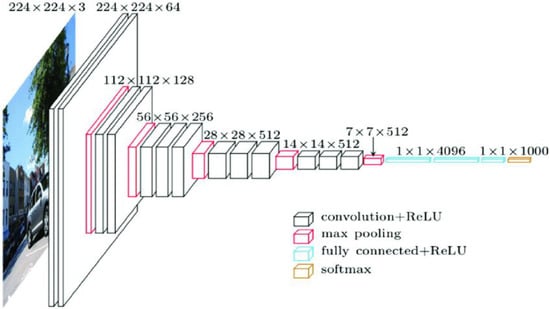 The VGG-16 consists of 13 convolutional layers and three fully connected layers as shown in Figure 5. A set of filters comprises a convolutional layer which is an essential block in any convolutional neural network. VGG-16 [25] has 13 of them. The parameters of the filters have to be learned. The size of the filter must be relatively less than the input. The features of the training set are extracted only using convolutional layers. The next layer in VGG-16 is the pooling layer. Generally, pooling layers are added between two convolutional layers. Pooling layers reduce the number of parameters between successive layers. There are two pooling functions, namely average and max pooling. Max pooling is generally preferred as it functions more efficiently. The flattened layer in VGG-16 converts feature maps into 1D tensors. The last layer is the fully connected layer which gives the output of the model.