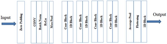 ResNet-50 is a variant of ResNet with 50 neural network layers [26] as shown in Figure 6, redrawn from [39]. Over the years, the higher accuracy and efficiency of neural network models have been achieved by deepening the neural network model, i.e., adding more layers and blocks or changing the filter size. This, however, is not always the case. Adding more and more layers can also cause performance degradation in deep learning. In order to overcome this, residual networks which are made up of residual blocks have been invented. The concept of skip connection is being introduced in residual models. While training a model, the skip connections skip some of the layers in the model (layers that are skipped vary from model to model). The output of one layer is fed as the input to another layer. This basically solves the problem of vanishing gradients in deep neural networks. The skip connections also ensure that the higher layers and lower layers of a model perform efficiently. The residual blocks in the model help to increase efficiency as learning becomes much easier.