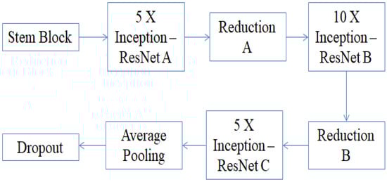 Inception ResNet-v2 basically uses the inception architecture combined with the residual connections from the ResNet network. The major improvement from the traditional model is the addition of a filter expansion layer to scale up the dimensionality of the filter bank before the addition to match the depth of input. The network has a total of 164 layers, as shown in Figure 7, redrawn from [39], and can classify the images in up to 1000 different categories, in the same way as the VGG-16 and ResNet-50. The input size of this network is 299 × 299 and the output is a list of estimated class probabilities.