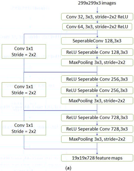 The Xception model uses depth-wise separable convolutions and works as shown in Figure 8a–c, redrawn from [27]. A general convolution step makes the spatial-wise and channel-wise computation in one single step. However, on the other hand, the depth-wise separable convolution divides the process of computation into two different steps. The depth-wise convolution initially adds a single convolutional filter to each input channel. It is then followed by point-wise convolution which creates a linear combination of the output from the depth-wise convolution. This method improves the efficiency of the model.