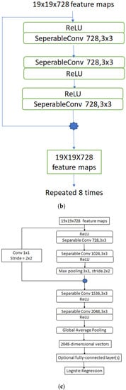 (a) The architecture of Xception entry flow; (b) the architecture of Xception middle flow; (c) the architecture of Xception exit flow.