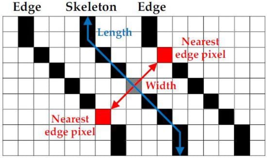 - Skeletonization: extracts the central skeleton of the crack which helps to identify the progression of the crack. Hence, it is possible to find the crack width by drawing a line perpendicular to the crack propagation direction at the pixel on the skeleton;