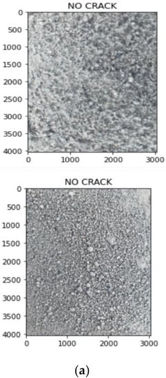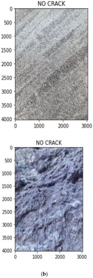 By searching the skeleton of the image through breadth-first search (BFS), the direction of the crack was estimated. Then the distance was calculated when the line of perpendicular met the edge of the crack, as shown in Figure 9. This was repeated multiple times until various widths were covered and the average of the distances obtained was used as the estimated width value of the crack. Figure 10 shows some sample images collected from industry. With multiple hand-selected images of various degrees of severity in the crack, accurate thresholds for high, medium, and low risk were identified by the proposed model. Figure 11a,b shows the sample of predicted output of the model “No Crack”, even though the images have many irregularities, grainy surface and complicated structure. Figure 12a,b shows the predicted output of the model “Low-Risk Crack”, Figure 13a,b shows the classified output of “Medium-Risk Crack”. Once a high-risk crack is detected, an immediate alert will be given to the authority and the necessary action will be taken to avoid accidents. The high-risk-classified crack images are shown in Figure 14a,b. Even though the images have different surface properties, the proposed model can effectively classify according to category. A confusion matrix was generated for all the models to assess the efficiency of the models and this is given in Table 2.