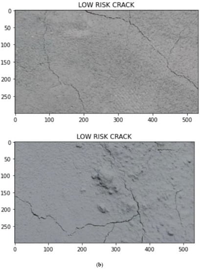 (a,b) Sample output images from the model classified as “Low-Risk Crack” for field images.