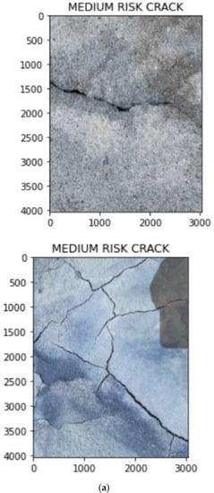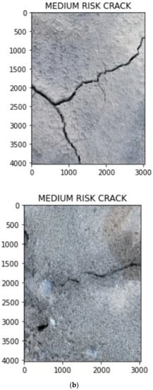 (a,b) Sample output images from the model classified as “Medium-Risk Crack”.