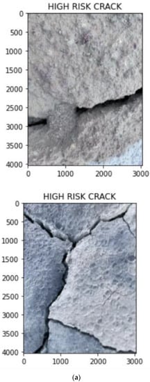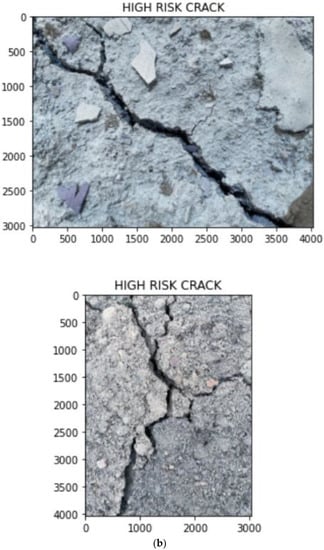 (a,b) Sample output images from the model classified as “High-Risk Crack”.