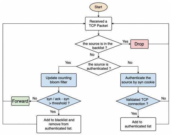 Such operations, whose flow is shown in Figure 3, allow early detection of ongoing attacks on the authentication phase and prune the remaining possible threatening flows in the second phase. The results show a drastic reduction in the server SYN queue usage when the P4 firmware is deployed in the network. Similarly, another three-step solution was proposed by Lin et al. [28]. Different from [27], the authors merged overlapping switch rules to minimize the number of dropped benign flows. Three concurrent components make up the solution. A detection oversees the ratio of SYN/ACK and ACK/FIN packets related to each network flow. Meanwhile, a merging phase is employed: here, multiple entries on a switch are simplified to a larger prefix to minimize the number of installed rules. The defense mechanism matches each attacker in a flow table rule: if the rule installed in the switches is LPM and an attacker is in that IP range, the rule is deleted, while if the rule is an exact match, the IP is dropped.