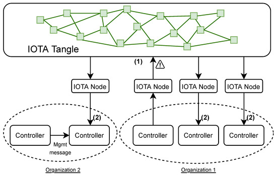As highlighted in Figure 5, organizations may manage multiple controllers, and if a controller detects a potential attack, it will communicate it to the IOTA node, which then notifies the interested controllers through the IOTA Tangle.