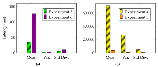 Each experiment was conducted by simulating a workload of 100 detected alerts, which was repeated 100 times for accuracy and consistency. In the scenario under consideration, the main objective for a community is to synchronize a defense posture in the lowest possible time, so our analysis focused on the latency metrics required for the main operations. Figure 7 shows the results of the first and second experiments. In Figure 8, we devise the remaining experiments based on the components under evaluation. The results of the experiments that pertain to the SDN components can be seen in Figure 8a for Experiments 3 and 6, while the results of the experiments related to the IOTA network are shown in Figure 8b for Experiments 4 and 5.