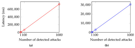 Time and computational analysis is critical in evaluating whether our proposal can be deployed in real-world scenarios. Figure 9 outlines that, in the IOTA network, the latency increased with an approximate complexity as the number of notified attacks scaled up, both for publishing detected attacks (Figure 9a) and retrieving them (Figure 9b).