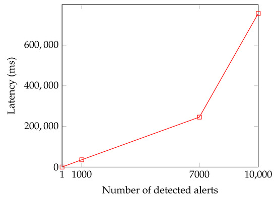 Regarding the SDN layer, Figure 10 illustrates the correlation between the number of alerts detected and the time required to forward them to the IOTA node. The graph shows a linear relationship for a rate of up to 7000 detected attacks. However, beyond that threshold, the latency increases gradually due to the limited bandwidth of the Southbound Interface, which has a maximum capacity of 14 Mbps in bmv2. It is worth noting that this test is not applicable to the retrieval phase. Installing thousands of rules on a switch can cause congestion in the match–action table, which should be minimally used.