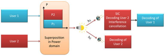 The first constraint is the minimal interaction range caused by the short wavelengths of visible light signals. It leads to significant propagation losses since the VLC channel strength deteriorates substantially as the space between receiving and transmitting devices grows, besides the fact that emission spectra are easily obstructed by obstructions [12]. Furthermore, unlike its typical RF counterpart, the VLC channel is not isotropic, which means that the geometry of the receiving and transmitting instruments have a substantial impact on channel gains [13]. Consequently, the VLC channel quality varies, and the efficiency of sophisticated multiple access strategies, for instance, NOMA, suffers when integrated with VLC systems. An overview of downlink NOMA-VLC for two users is presented in Figure 1. We have summarized recent works on NOMA in Table 1.