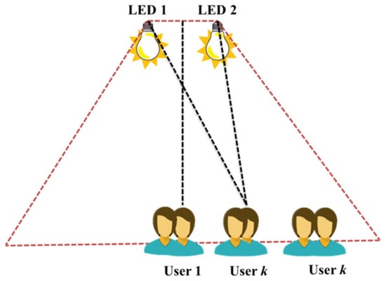 In a recent study [17], the authors extend NOMA to MIMO-VLC systems and provide a cutting-edge power distribution technique, called normalized gain difference power allocation (NGDPA), for effective and simple power distribution in MIMO-NOMA-VLC systems. Numerical simulations are used to assess the total rate performance of a 2 × 2 MIMO-NOMAVLC system installed inside. It is demonstrated that, as compared to NOMA with GRPA, the achievable sum rate of the 2 × 2 MIMO-VLC system may be substantially increased by using NOMA with the suggested NGDPA approach. A 2 × 2 MIMO-VLC system for k number of users is illustrated in Figure 4.