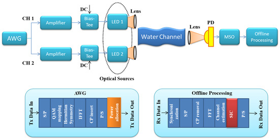 Block diagram of two-user NOMA-based VLC system with QAM and O-OFDM.